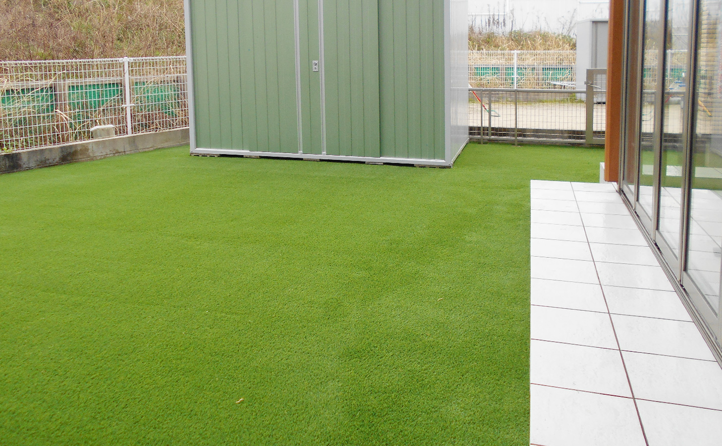 弊社の人工芝は10年耐久の紫外線加工を施しているので、すぐボロボロになることはございません。臭いが気にあるとのことでしたので、防臭機能のある「サンターフAg+」をご提案させていただき、さらに消臭効果が期待できる「ゼオライト」施工も合わせてご提案致しました。