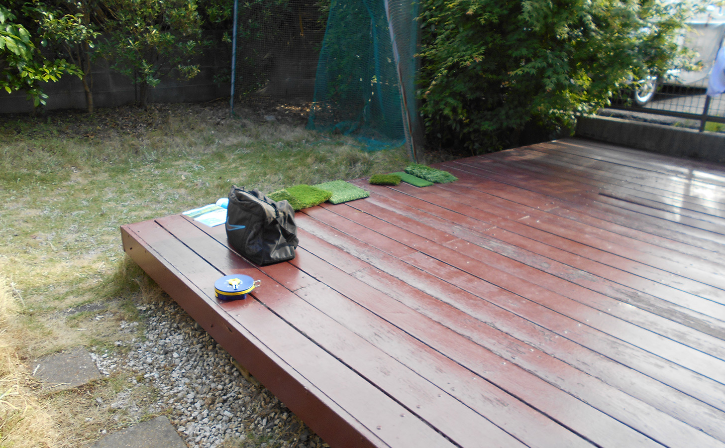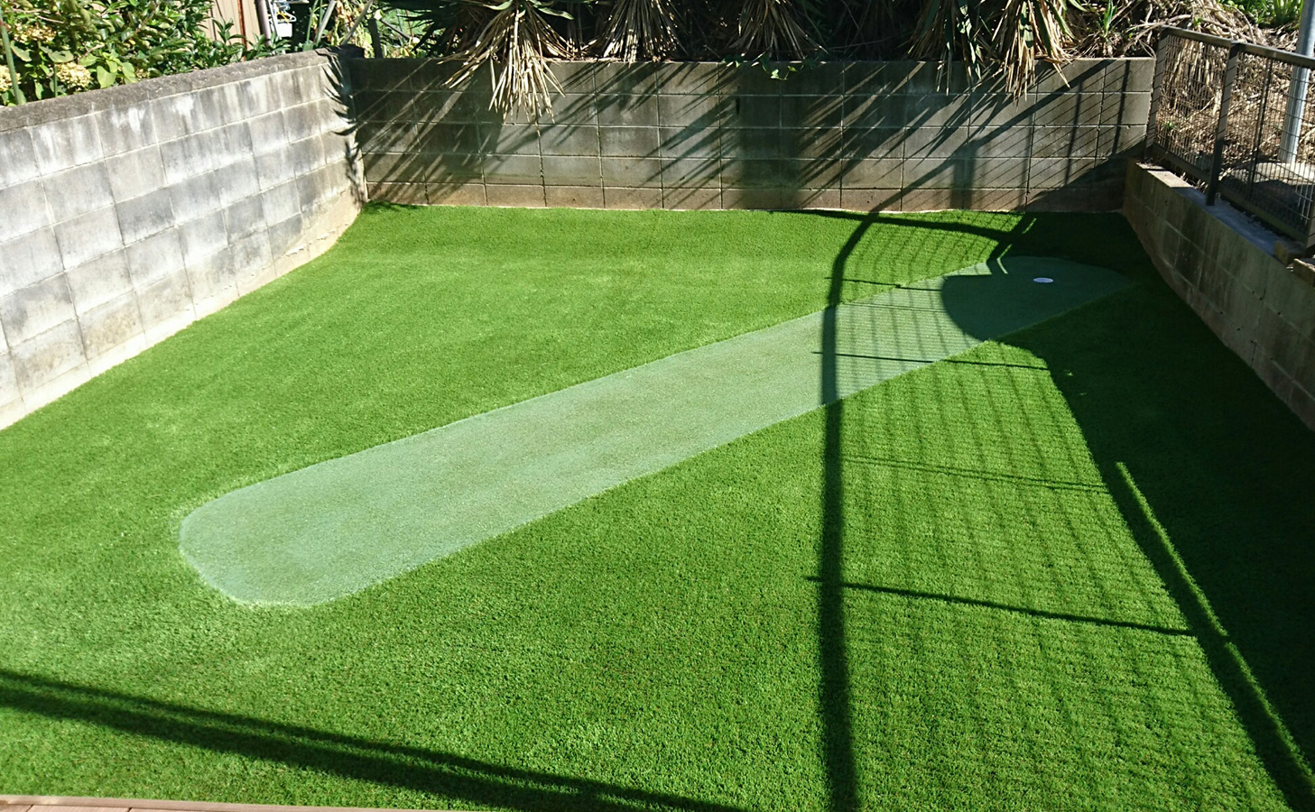 人工芝でパッティンググリーンをつくれば、メンテナンスは不要です。長い距離のパットが練習したいとの事でしたので、斜めにグリーンを設置させて頂きました。素振りや、ちょっとした寄せの練習も楽しむことができます。