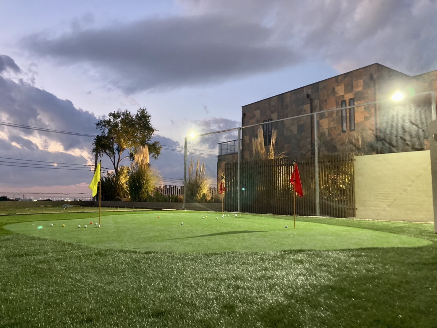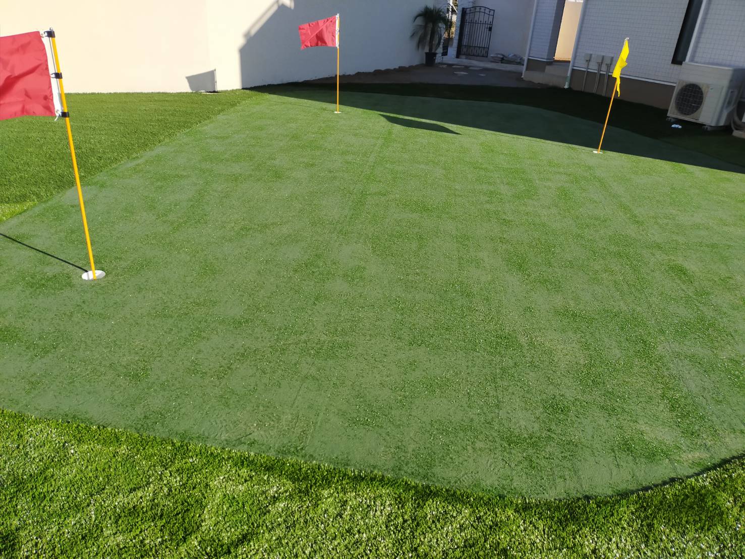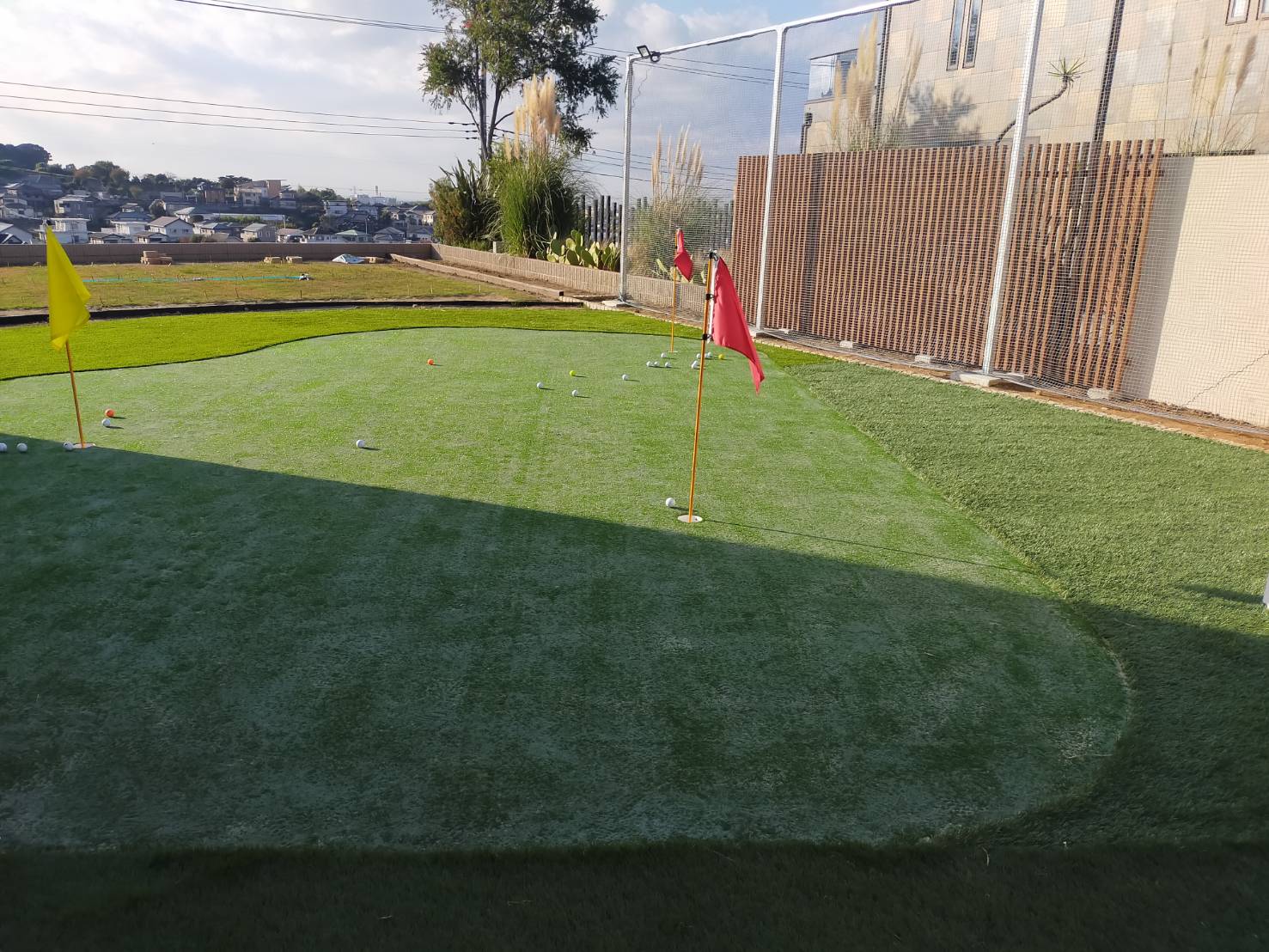 周りからのアプローチも楽しめる、人工芝のパッティンググリーンと、防球ネット・鳥籠が欲しい。 ゴルフ練習が出来るお庭を造りたい。